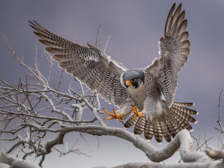 ZIYA TONG: But that doesn’t take away from those fierce hunting skills. In fact, peregrine falcons even have a signature hunting move. It’s called a stoop. Picture this: a large bird, about the same size as a crow, with a sharp, curved yellow beak, flies high up into the air—so high you can barely see it. It circles around a few times, and then, with no warning…it dives.